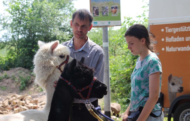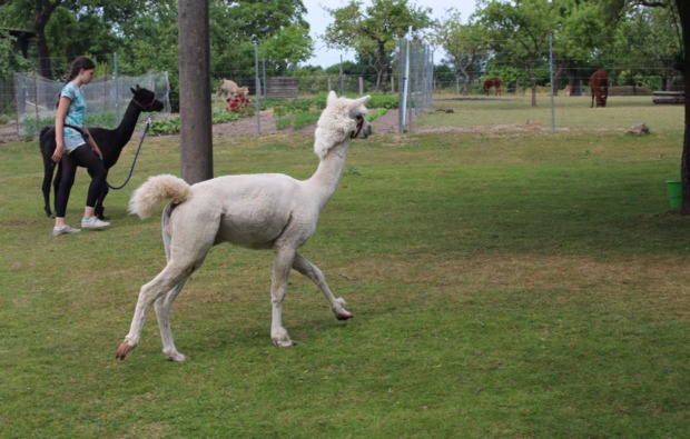 Am Alpakahof angekommen, kann‘s gleich losgehen. Gemeinsam mit den anderen Teilnehmern und den Tierpflegern bereitet Ihr die Tiere auf die bevorstehende Wanderung vor. Jedes Tier bekommt eine Leine zur Führung umgelegt. Zwei davon nehmt Ihr in die Hände und Abmarsch! Eure Alpakas und Ihr startet los hinaus ins Grüne!