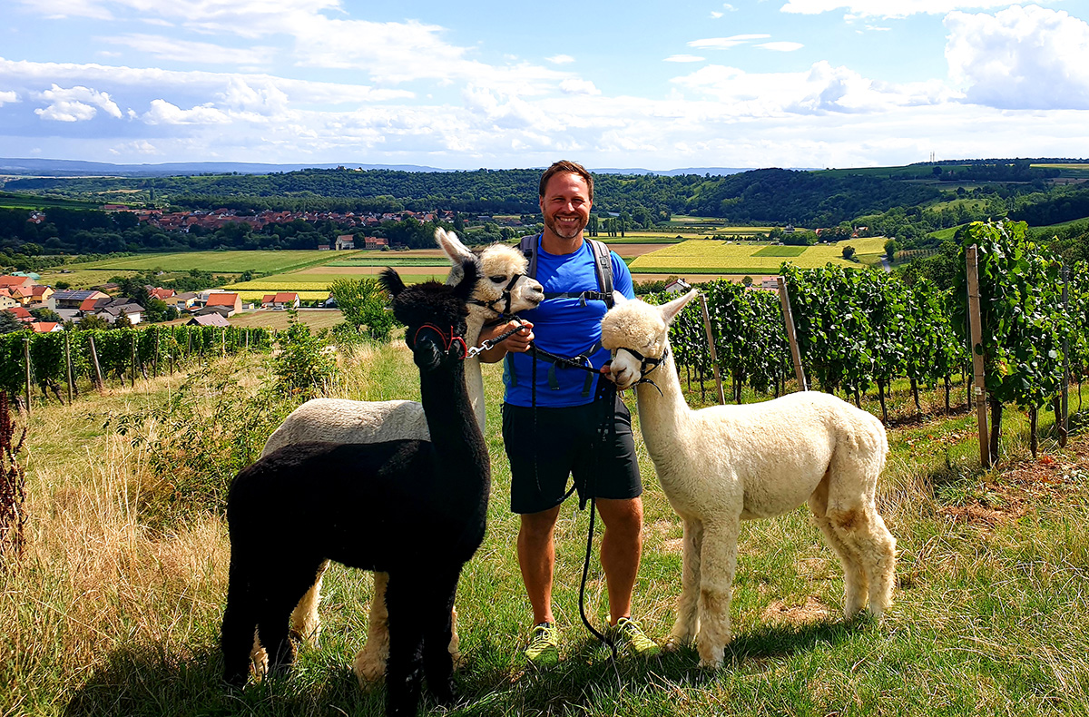An der Erlebnislocation angekommen siehst Du sie schon aus der Ferne auf der Weide stehen. Die zuckersüßen Alpakas, mit denen Du heute den Tag verbringst. Nachdem Ihr Euch miteinander vertraut gemacht habt, geht die Wanderung auch schon los. Die sanftmütigen Tiere können es kaum erwarten, mit Dir durch die fränkische Landschaft zu spazieren. Bei Sonnenschein geht es sogar durch die Weinberge, aber keine Sorge, es gibt auch genug Zeit für Pausen. Dabei kannst Du durchatmen, Fotos machen und die friedliche Ruhe der Natur genießen.