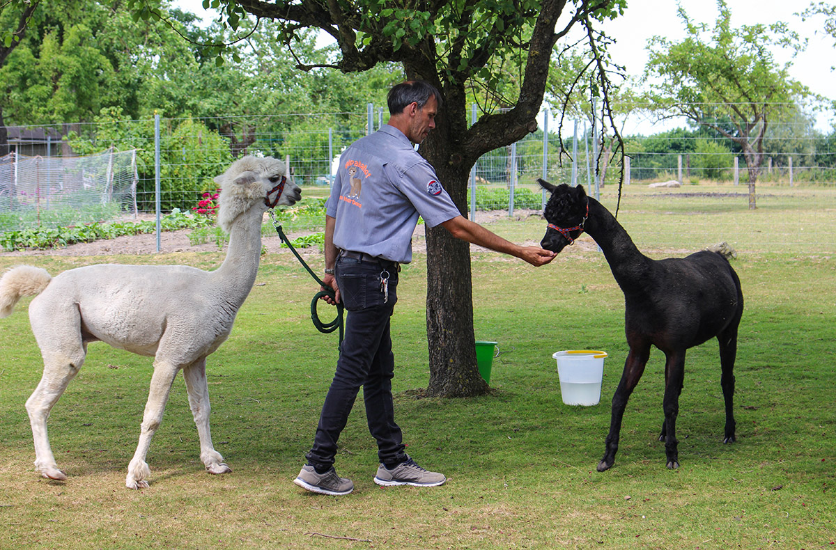 Am Alpakahof angekommen, kann‘s gleich losgehen. Gemeinsam mit den anderen Teilnehmern und den Tierpflegern bereitest Du die Tiere auf die bevorstehende Wanderung vor. Jedes Tier bekommt eine Leine zur Führung umgelegt. Eine davon nimmst Du in die Hand und Abmarsch! Dein Alpaka und Du startet los hinaus ins Grüne!