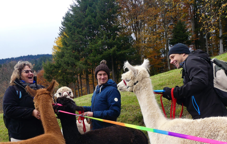 Über grüne Wiesen wandert Ihr mit Blick auf den 1224 m hohen Köhlgarten. Das Wetter ist sonnig und angenehm warm. Neben Euch laufen Eure beiden Alpakas. Ganz ruhig und gelassen. Da darf eine kleine Streicheleinheit nicht fehlen. Das Fell ist ganz weich und flauschig. In den Verschnaufpausen könnt Ihr alle Eure Fragen zu den Vierbeinern stellen. Nachdem sie beantwortet wurden, geht es wieder zurück. Ihr helft noch beim Abhalftern und könnt ein Erinnerungsfoto mit Eurem Alpaka machen.