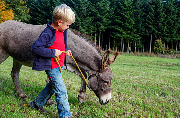 Voller Vorfreude stapfst Du mit Deinem Esel los. Du hältst seine blaue Leine fest in der Hand, während er gemütlich neben Dir her trottet. Gemeinsam läuft Ihr über einen Feldweg. Zu deiner Linken ist ein dunkelgrüner Nadelwald, aus dem fröhliches Vogelgezwitscher zu hören ist. Zu deiner Rechten erstrecken sich saftig grüne Wiesen. Du musst aufpassen, dass Dein Esel jetzt nicht das Gras interessanter findet als die Wanderung! Du genießt die Ruhe der Natur, während dich Dein vierhufiger Wanderpartner freundlich anguckt. Das Ih-ah lässt Dein Herz höherschlagen! Nach der Wanderung entdeckst Du die anderen Tiere auf dem Eselhof. Kuschelige Hasen, süße Hunde und kleine Ponys warten darauf, von Dir gestreichelt zu werden!