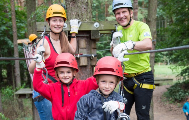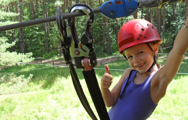 Vorsichtig arbeitest Du Dich durch die unterschiedlich schweren Routen, immer ein Stückchen weiter nach oben, immer ein Stückchen näher an Deine Grenzen. Der Hochseilgarten ist in unterschiedliche Routen mit verschiedenen Schwierigkeitsgraden unterteilt, sodass Du Dich langsam an die schwierigeren Strecken herantasten kannst. Irgendwann wird sicher der Punkt kommen, an dem Du vor einem neuen Hindernis stehst und Dir denkst, es geht nicht mehr. Doch dann überwindest Du Dich und setzt mutig einen Fuß auf das wackelige Hindernis vor Dir. Mit pochendem Herzen arbeitest Du Dich langsam, Schritt für Schritt, über die Strecke. Vor lauter Konzentration auf den nächsten Schritt, merkst Du gar nicht, wie weit du schon gekommen bist. Schließlich setzt Du einen Fuß auf die feste Plattform auf der anderen Seite der Stecke. Voller Stolz kannst Du nun auf das überwundene Hindernis zurückblicken. Glücklich atmest Du tief die frische Waldluft ein und genießt den grandiosen Ausblick durch den Wald. Vielleicht traust Du Dich ja auch gleich an die nächste Herausforderung?