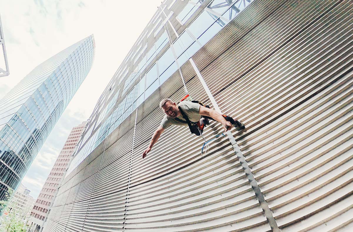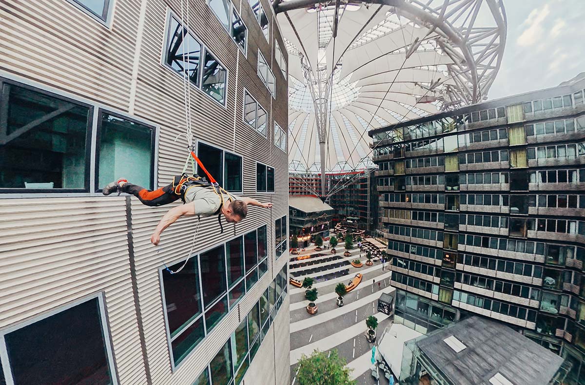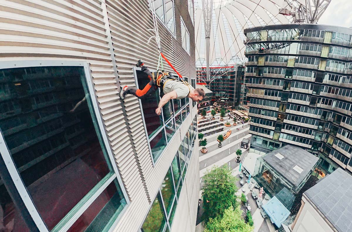 In schwindelerregender Höhe setzt Du den ersten Fuß auf die Dachkante und seilst Dich mit dem Gesicht nach vorn in Richtung Boden. Während Deiner ersten Meter nach unten wird Dir schnell bewusst, das House Running auf 40 Meter kein Schaufensterbummeln ist. Aber als mutiger Absteiger kennst Du keine Grenzen und erst recht keine Angst. Schreite Schritt für Schritt die Wand hinab und beweise absolute Nervenstärke. Was Dein Erlebnis besonders macht, ist der Mega-Kick mit Panorama-Blick. Ganz Berlin liegt Dir zu Füßen und Du genießt unvergessliche Momente, die Dir keiner mehr nehmen wird. Langsam und parallel zum Boden kommst Du sicher und wohlbehalten an Deinem Ziel an. Du blickst nach oben und realisierst den Weg, den Du gerade erfolgreich gemeistert hast. Sowas erlebst Du nicht jeden Tag. Dein ganz persönliches Abenteuer vom House Running dauert etwa 30 Minuten.