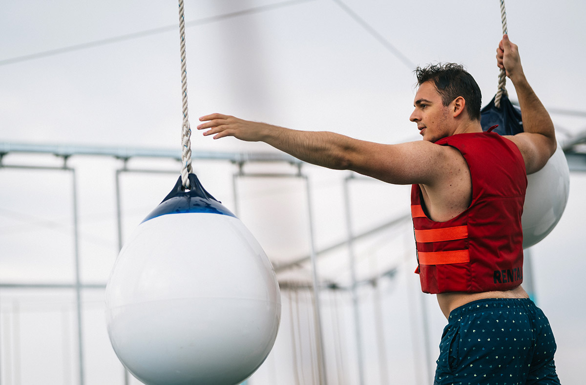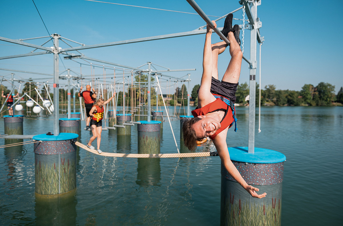 Der Hochseilgarten bietet drei spannende Parcours, die zu jedem Zeitpunkt von erfahrenen Instruktoren betreut werden. Egal ob Anfänger oder Profi, jeder findet hier seine Herausforderung. Der Einstieg erfolgt mit einem erfrischenden Schwimmen zum Parcour und macht damit das Erlebnis bereits einzigartig.
