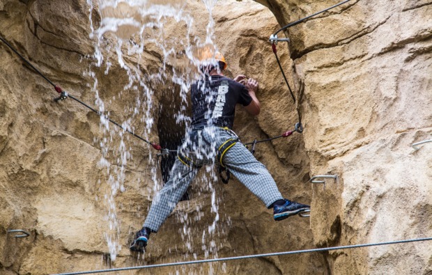 Klettern in der Outdoor-Bergwelt (10 Kletterrouten am Felsen, 8 Erlebnishöhlen, 1000 natürliche Griff- und Trittstrukturen, 7m hoher Wasserfall, Gipfelkreuz mit Gipfelbuch)