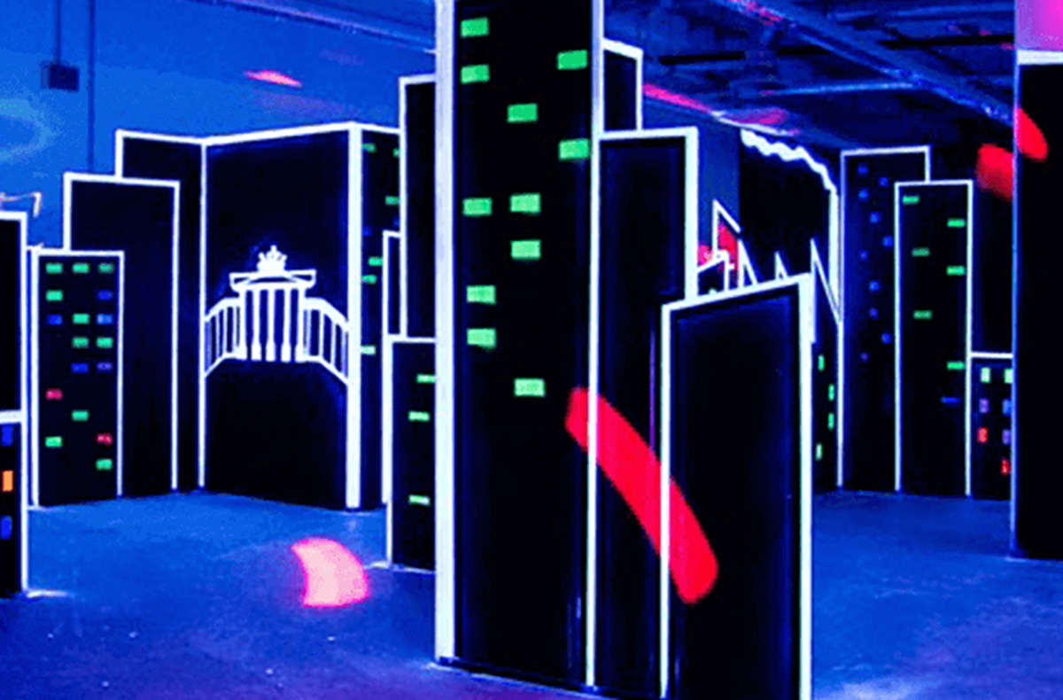 Lasertag in moderner Arena mit verschiedenen Spielflächen und Spielelementen