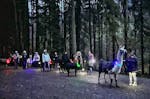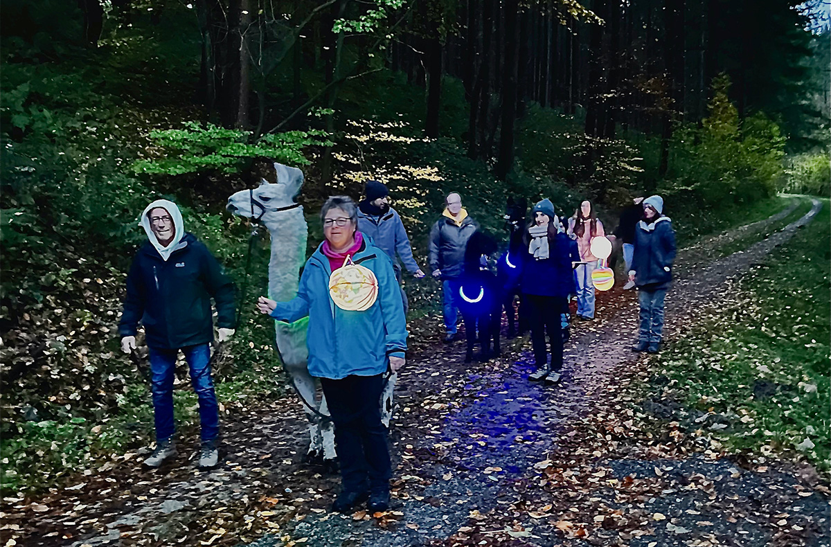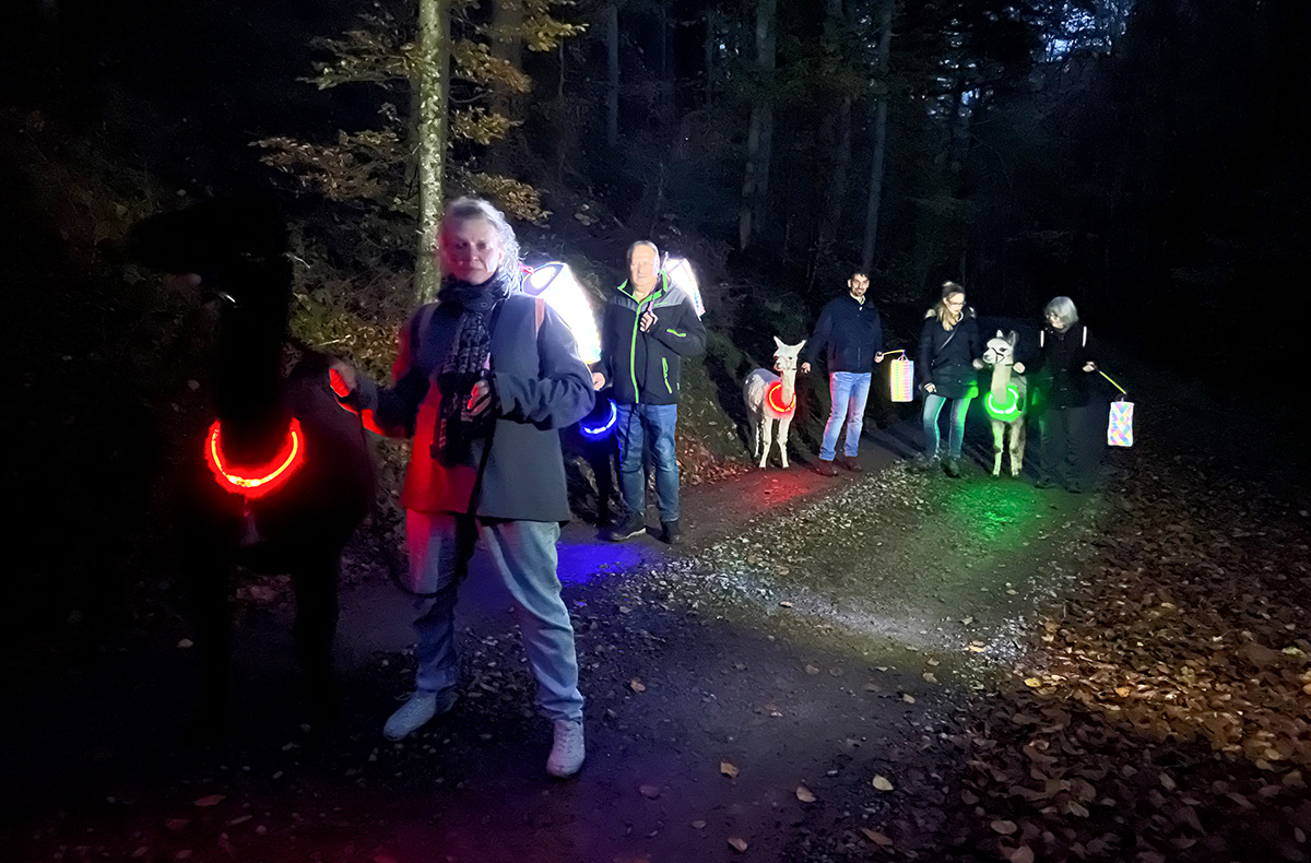 Die Wanderung startet am Hof und führt Euch über idyllische Feld- und Waldwege zurück zum Ausgangspunkt. Besonders eindrucksvoll ist das Ende der Wanderung, das in die Dämmerung bzw. Dunkelheit hineinführt. Pro Alpaka wird eine Laterne mitgeführt, die von den Tierführern gestellt wird – Ihr könnt jedoch gerne auch eigene elektrische Laternen mitbringen.