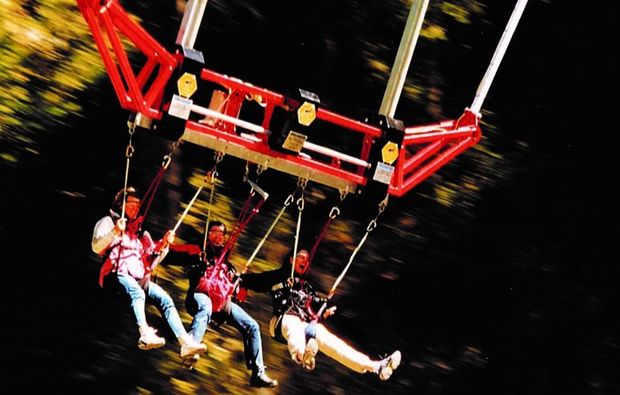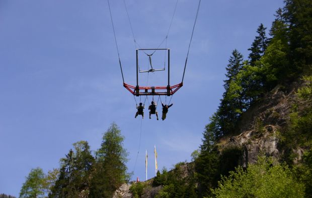 Vor dem Schaukeln in dieser Höhe erfolgt ein Sicherheitscheck aller Teilnehmer. Zu Dritt dürft ihr euch mit Tragegurten fachmännisch befestigt komplett sicher fühlen und den Adrenalinrausch genießen. Aber ihr springt nicht wie beim Bungee Jumping von der Brücke. Eure Schaukel ist hier befestigt und wird mit den Teilnehmern in Position gezogen. Wie früher, wenn die Eltern einen beim Schaukeln angestoßen haben, nur zigfach größer, schneller und rasanter. Am höchsten Punkt erreicht, darf einer von euch bestimmen wann es losgeht. Hast Du die Nerven Dich und Deine Freunde aus der Halterung zu klinken, um mit enormer Geschwindikeit durch die Baumwipfel des Lesachtals zu fliegen? Zu spät um auszusteigen, denn es geht schon los: Wow! Was für ein Gefühl! Das Adrenalin rauscht, der Wind bläst euch durch die Haare und es ist ein Wahnsinnsfeeling. Die Riesenschaukel schwingt mit Leichtigkeit durch die Luft und ihr genießt diese Freiheit.