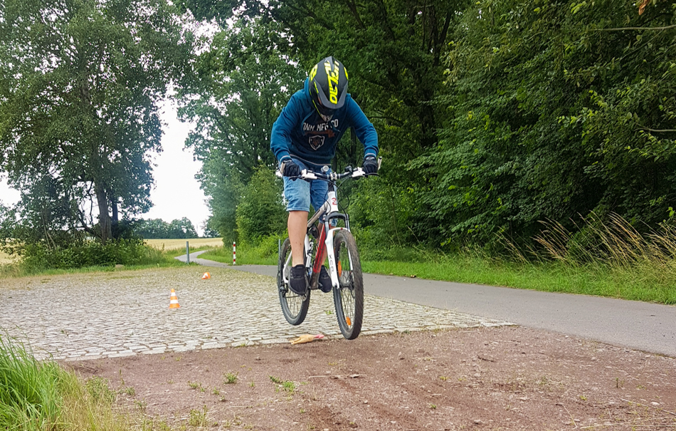 Nachdem die Basics sitzen, geht’s ans Eingemachte. Im angrenzenden Wald-Gelände werden die erlernten Skills bei einer kleinen Tour direkt in die Tat umgesetzt. Ob Baumstämme, wuchernde Wurzeln oder massive Hindernisse, kein Problem mehr für Euch! Der Mountainbike-Kurs bietet optimale Vorbereitung, jegliche Barrikaden selbstbewusst und sicher zu umfahren.