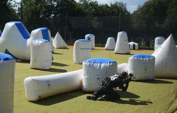 Damit Du auch perfekt für das Paintball Match ausgerüstet bist, erhältst Du vor Beginn noch einen Farbmarkierer, eine Druckluftflache und eine Schutzmaske. Darüber hinaus wirst Du mit einem Battlepack, Handschuhen und Halsschutz ausgestattet. Frauen erhalten außerdem einen speziellen Brustschutz. Doch nun kommt das Wichtigste. Insgesamt 500 Paintballs stehen Dir zur Verfügung, mit denen Du Deine Gegner ausschalten kannst.