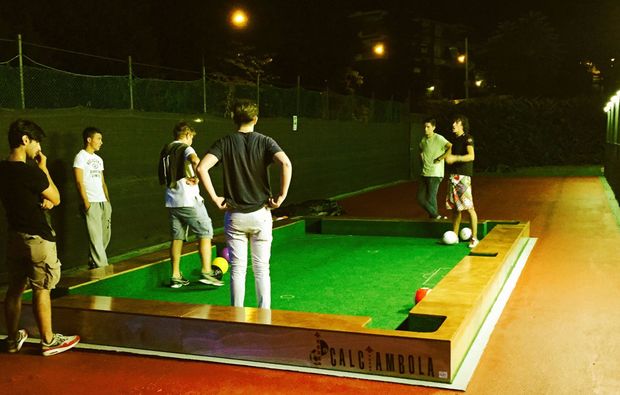 Das Ziel ist beim Pool Soccer in Stuttgart genau wie beim Billard, die Bälle in die Seitentaschen des Spielfelds zu befördern. Heute spielt Ihr aber nicht mit richtigen Billardkugeln, sondern mit Fußbällen in Billardkugeloptik. Die dürft Ihr mit den Füßen oder dem Kopf ins Ziel bringen. Jetzt ist jeder aus Eurer Gruppe mit seinen ganz speziellen Fähigkeiten gefragt: Wer kann gut mit dem Ball umgehen? Wer zielt am besten? Und wer beweist Köpfchen und entwickelt eine gute Spieltaktik? Für den Erfolg beim Pool Soccer sorgen nicht unbedingt die besten Fußballer, jeder aus Eurer Gruppe kann Euch mit seinen Talenten zum Sieg verhelfen! Und wer etwas wagemutiger ist, kann auch einmal einen raffinierten Kopfball probieren. Egal, auf welche Weise Ihr die Bälle ins Ziel befördert, beim Pool Soccer sind Euch auf alle Fälle jede Menge Spaß und Action garantiert, sodass Ihr Euch noch lange an dieses Erlebnis zurückerinnern werdet.