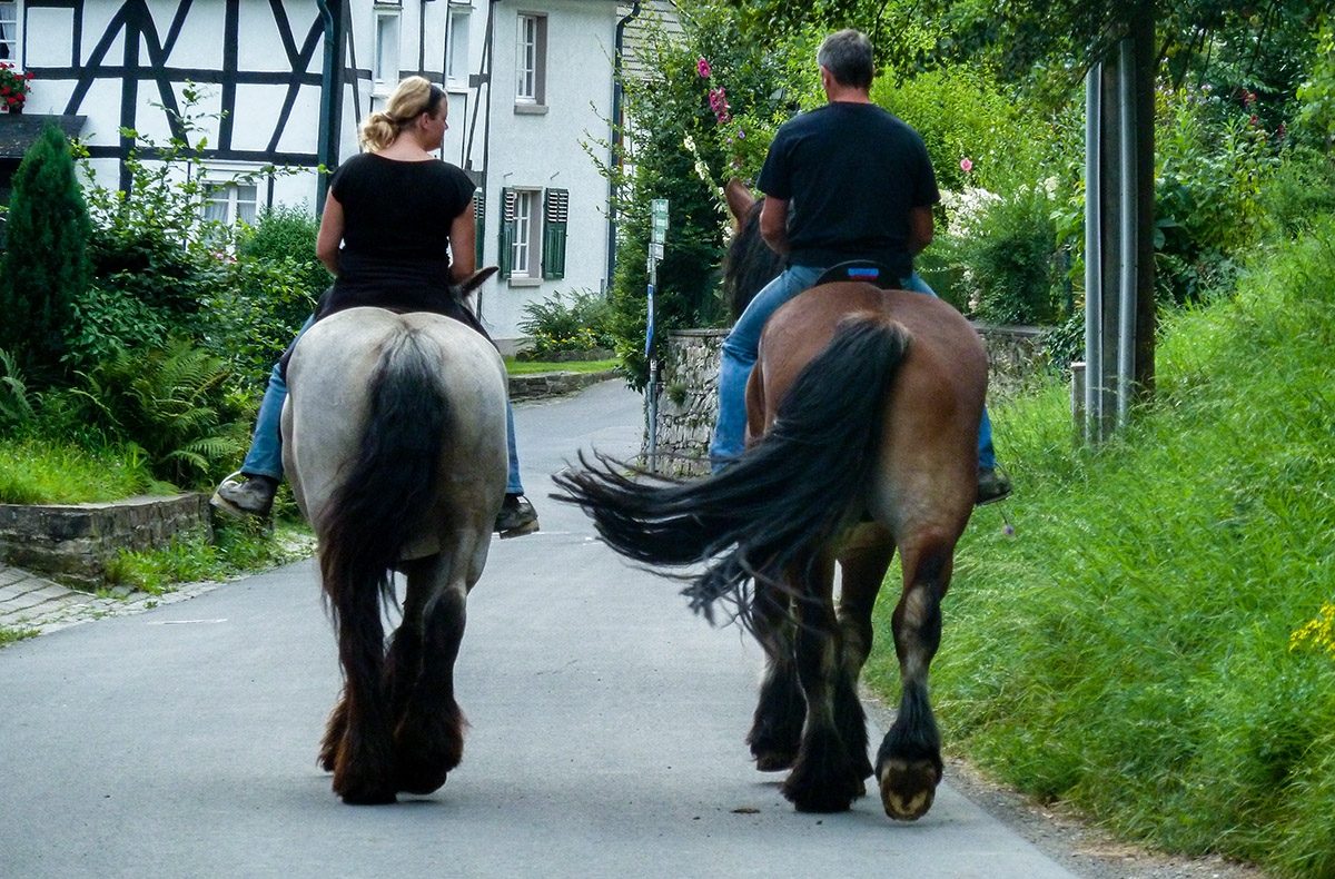 Auf dem Rücken des Kaltblüters fühlst Du Dich sofort wohl. In einem gemütlichen Tempo erkundet Ihr zusammen das wunderschöne Siegtal. Grüne Hügel und Wälder und das gleichmäßige Traben der Pferde sorgen für eine idyllische Atmosphäre. Du kannst Dein Glück kaum fassen und willst nicht, dass dieser Ausflug zu Ende geht. Also genieße jede Sekunde des Ausritts und spüre die Harmonie zwischen Reiter und Pferd!