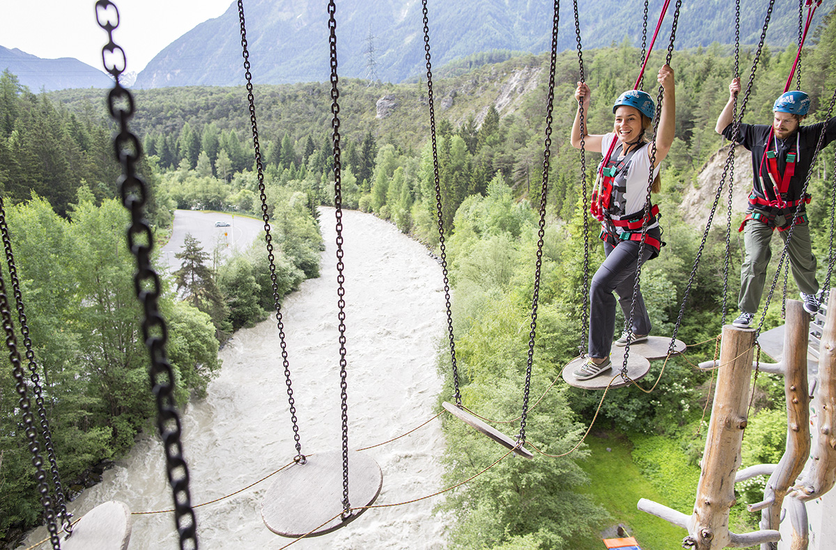 …auf den Holzbalken über dem Abgrund. Rund 27 Meter geht es in die Tiefe und es gilt die Devise: Einfach nicht nach unten schauen. Die Beine zittern, Du kletterst durch Netze und schreitest langsam voran. Wow, ein tolles Gefühl! Für den Rest des Tages tobst Du Dich im Wasserpark Water AREA aus. Rutsche, springe ins Wasser und genieße das Panorama der Ötztaler Bergwelt.