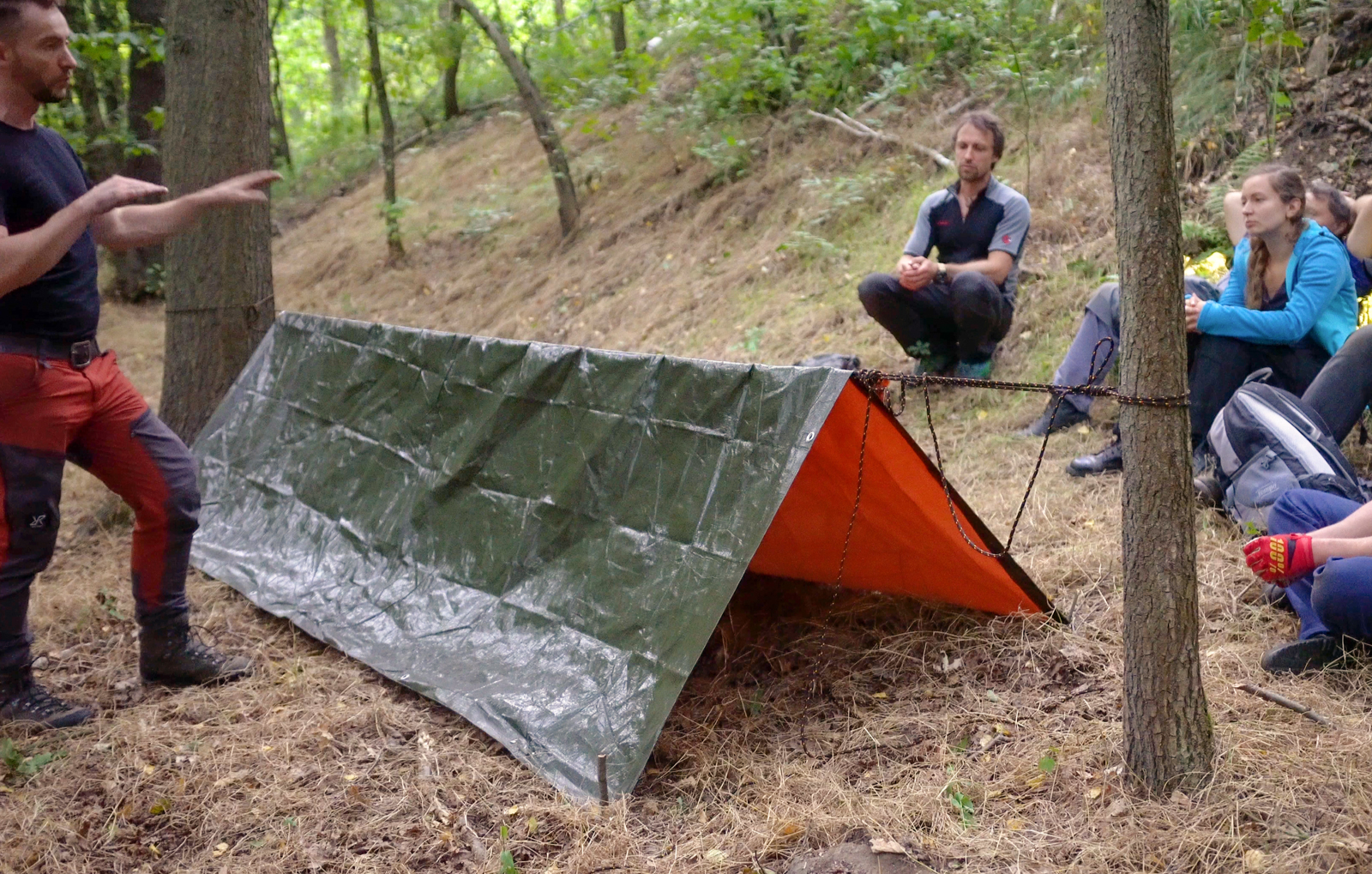 Vorstellung verschiedener Notunterkünfte mithilfe von Plane und Naturmaterialien