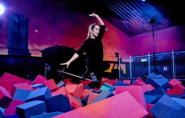 Dann geht endlich der Spaß auf dem Parcours richtig los. Tobt Euch bei den verschiedensten Stationen für 60 Minuten so richtig aus. Nutzt die ganzen 3.000 qm Sprungfläche aus und erlebt ein absolutes Hüpfvergnügen in der Trampolinhalle in Duisburg. Auf der 15 Meter langen Trampolinbahn trainiert Ihr verschiedenste Sprünge und fliegt wild durch die Luft. Im Spider Tower könnt Ihr Eure Geschicklichkeit testen. Klettert ein Gerüst nach oben und gelangt dann mit einer Rutsche wieder nach unten. Auf dem Balance Court schult Ihr Euren Gleichgewichtssinn und bekämpft Euch auf den Slacklines mit Schaumstoffpolstern. Wer wird hier am längsten die Balance halten? Lasst Euren Ideen in der Trampolinhalle in Duisburg freien Lauf und habt jede Menge Spaß dabei!