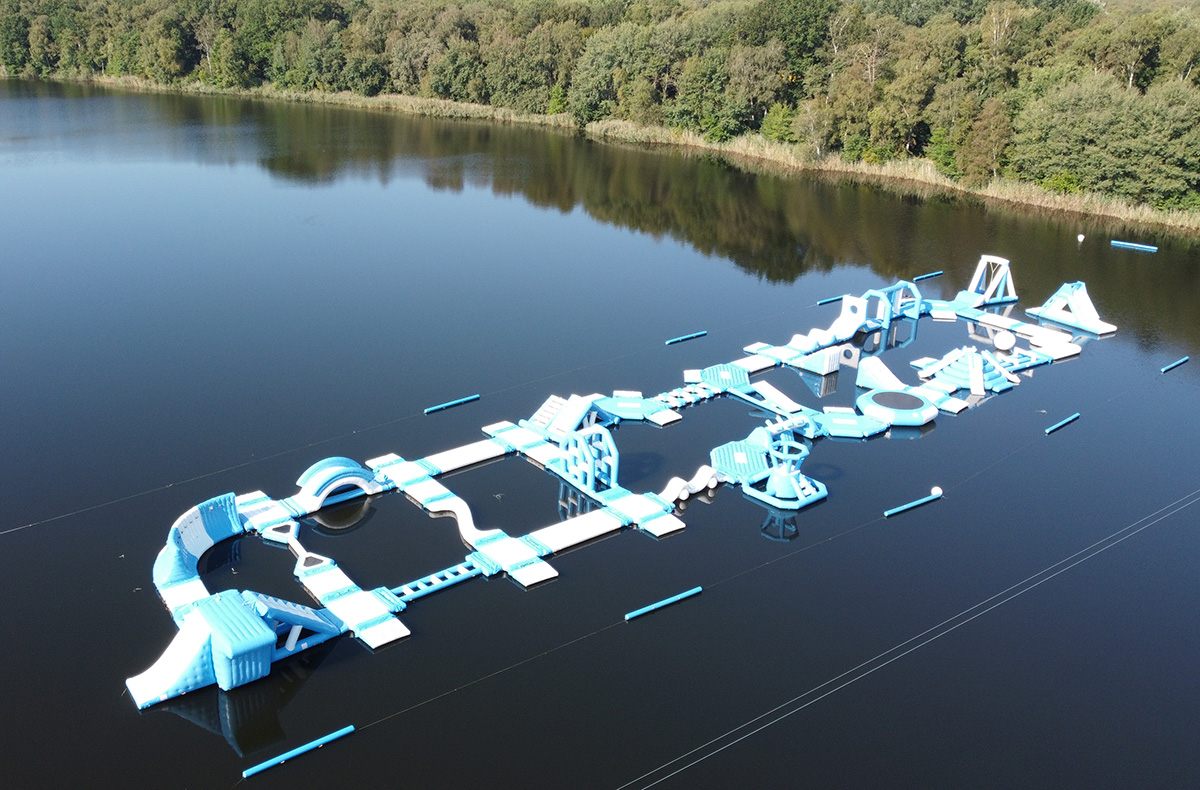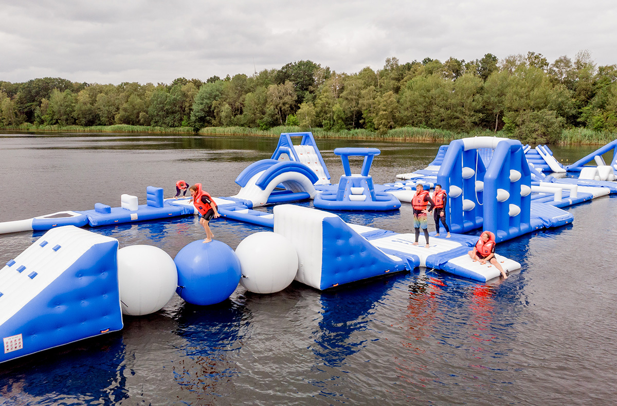 - Riesiger, schwimmender Wasserpark mit verschiedenen Elementen (Klettern, Springen und Rutschen)