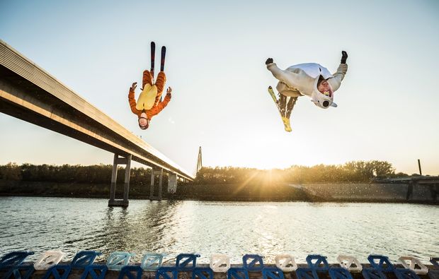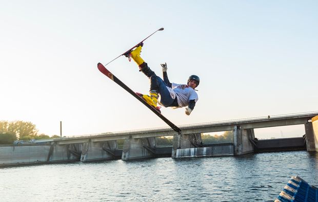 Runter von der Couch und rauf aufs Alpen-UFO, Ski oder Snowboard. Bevor Euer gemeinsames Erlebnis beginnen kann, werdet Ihr intensiv auf den Ablauf, das Material und die Wasserschanze vorbereitet. Mit einem Helm, einer Schwimmweste und einem Neoprenanzug seid Ihr bestens gewappnet für das kühle Abenteuer. Für Euch heißt es jetzt: Ab auf die Rampe, Schlaufen in die Hand nehmen, gut festhalten und Gas geben. Mit gebeugten Knien habt Ihr einen festen Stand auf dem Board oder den Ski und könnt Euch in unterschiedlichen Manövern üben. Nebeneinander gleitet Ihr über das Wasser und erlebt Nervenkitzel, wie Ihr es selten zuvor gespürt habt. Bei Eurer Tageskarte Waterramp für zwei Personen könnt Ihr 6-8 Stunden einplanen. Ein Trampolin ist auf der Anlage inklusive und sorgt für zusätzlich Spaß. Geeignete Badebekleidung bringt Ihr von zu Hause selber mit.