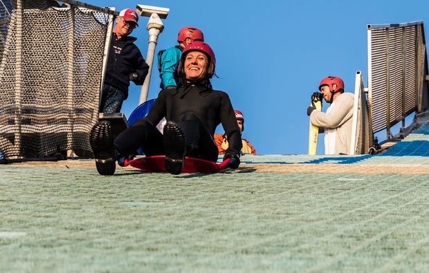 Herzlich Willkommen in Wien, wo Dein ganz persönliches Abenteuer mit der Waterramp losgeht. Vor Ort erhältst Du zunächst eine intensive Einweisug in Dein bevorstehendes Abenteuer und wirst vertraut gemacht mit dem nötigen Material und der Wasserschanze. Um Dich so sicher wie möglich zu fühlen, bekommst Du eine Leihausrüstung angelegt, die aus einem Helm, einer Schwimmweste und einem Neoprenanzug besteht. Zur Auswahl stehen das Alpen-UFO, das Ski- oder Snowboard. Mit was möchtest Du beginnen? Bist du eher der Skifahrer, Snowboarder oder der Schlittenfahrer? Doch hier bist Du nicht auf der Piste, sondern fährst über eine Rampe ins kühle Nass! Bereit für Deine neue Herausforderung? Dann schnappe Dir das Alpen-UFO, Ski- oder Snowboard und rauf auf die Rampe. Nimm eine gerade Haltung ein und halte Dich an den vorgesehenen Schlaufen fest. Mit Höchstgeschwindigkeiten überfliegst Du das Wasser und übst Dich in unterschiedlichen Manövern. Das Mindestalter beim der Waterramp beträgt 12 Jahre und ein körperliches Fitnesslevel ist nicht vorausgesetzt. Ein Erlebnis für alle diejenigen, die nach einer großen Portion Spaß und Action suchen. Insgesamt dauert das Abenteuer der Wasserschanze ganze 6-8 Stunden und lässt Dich garantiert noch lange an ein gelungenes Erlebnis erinnern.