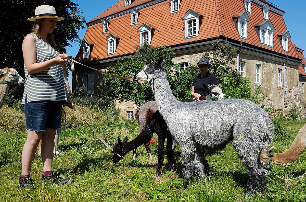 Mit einem eigenen Alpaka an der Leine durch die wunderschöne Landschaft wandern – bei der Alpaka Wanderung in Wermsdorf wird Euer Traum endlich wahr! Jetzt geht’s endlich los! Nicht nur die süßen Plüschtiere werden Euch begeistern, sondern auch die Idylle draußen im Grünen. Wusstet Ihr, dass Ihr beim Streicheln Stress abbauen könnt und eine Menge Glückshormone ausschüttet? Alpakas gelten als echte Therapietiere. Von der entspannten Wanderung zurückgekehrt, könnt Ihr Euch im gemütlichen Hofladen noch umsehen. Wirklich faszinierend, was man alles aus der Alpakawolle herstellen kann!