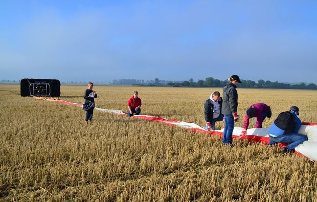 Der Ablauf einer Ballonfahrt beginnt mit dem Auslegen der Hülle und dem Zusammenbau des Korbes mit Zubehör. Sobald die Hülle mit heißer Luft gefüllt wurde und sich zu ihrer vollen Größe emporhebt, steigst Du in den Ballon ein.