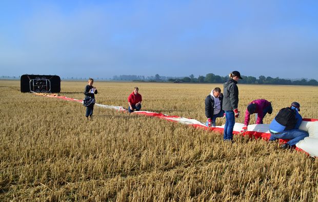 Doch bevor es in die Luft geht, beginnt Deine Ballonfahrt mit dem Auslegen der Hülle und dem Zusammenbau des Korbes. Sobald die Hülle mit heißer Luft gefüllt wurde und sich zu ihrer vollen Größe emporhebt, steigst Du in den Ballon ein.