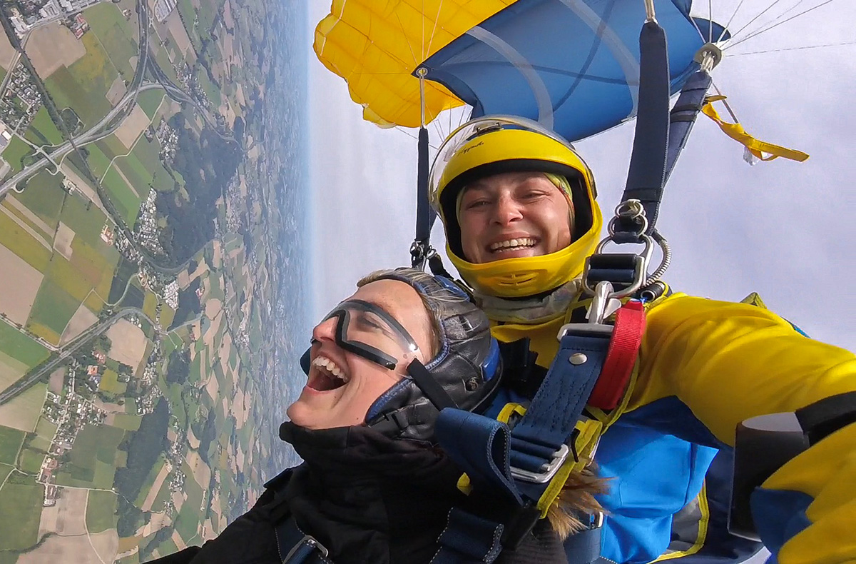 Mit dem Wind im Gesicht genießt Du einen atemberaubenden Blick über die Landschaft. Von oben bestaunst Du leuchtend grüne Wiesen und Felder aus dunklen Baumkronen. Der erfahrene Tandem-Master sorgt dabei stets für Deine Sicherheit. Ein wohliges Gefühl von Freiheit macht sich in Dir breit. Als Andenken an Deinen mutigen Sprung erhältst Du nach dem Abenteuer eine Urkunde.