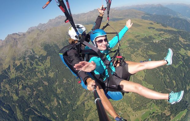 Gemeinsam mit dem Profi machst Du nun ein paar Schritte, bis Du schließlich in die Luft trittst – Du schwebst! Vollgepumpt mit Adrenalin geht es nun schleunigst in die Höhe, denn bei einer günstigen Thermik steigst Du beim Gleitschirmfliegen einige Meter pro Sekunde. Schließlich hast Du eine Flughöhe von bis zu 3.000 Metern oder sogar mehr erreicht. Hier kreist Du nun etwa eine Stunde durch die Luft – wie lange genau, hängt ganz vom Wetter ab. Du erlebst beim Gleitschirm-Tandemflug eine unglaubliche Aussicht auf die Lienzer Dolomiten, aber auch auf die umliegenden Berge, wie den Großglockner, der sich majestätisch aus dem Tal erhebt! Nach dem Gleitschirm-Tandemflug landest Du auf einer Höhe von rund 660 Metern – mit einer einzigartigen Erfahrung im Gepäck!