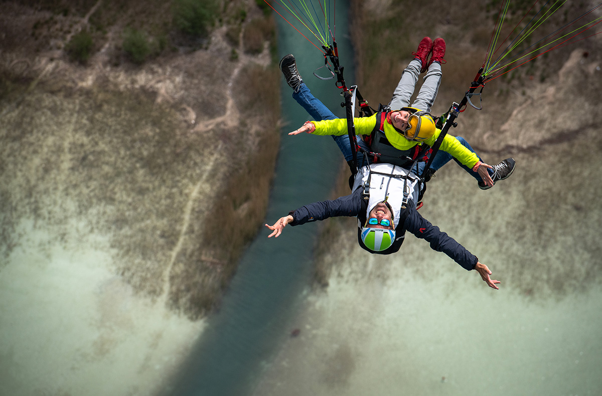 Mit einer Geschwindigkeit von rund 40 km/h fliegt Ihr über die Landschaft und genießt die spektakuläre Aussicht auf den Walchsee, die Tiroler Alpen und das Fellhorn. Alles erscheint von oben aus winzig klein, während Du Dich entspannt zurücklehnst und Dich die perfekte Thermik höher trägt. Nach einem ruhigen Gleitflug nähert Ihr Euch der Landebahn und setzt sanft auf dem Boden auf.