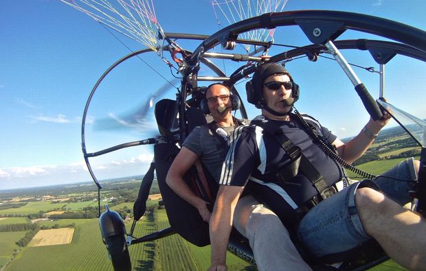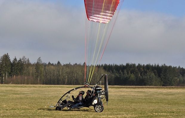 Am Treffpunkt in Hörsten wirst Du vom Piloten freundlich in Empfang genommen. Nach der netten Begrüßung bekommst Du von ihm eine ausführliche theoretische Einweisung in Deinen Motorgleitschirm-Rundflug. Er erklärt Dir alles Spannende rund um den Motorgleitschirm und gibt Dir einige Hinweise, die Deiner Sicherheit dienen – so kannst Du den Motorgleitschirm-Rundflug in allen Zügen genießen. Doch was ist ein Motorgleitschirm eigentlich? Man nehme ein Zweisitzer-Gestell, hänge einen Gleitschirm daran und befestige einen Motor daran!