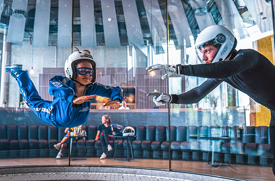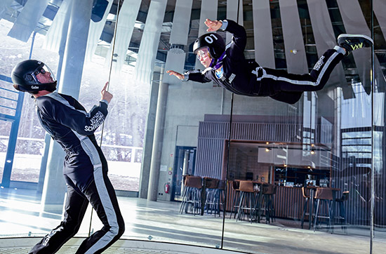 Die Idee des Bodyflying ist fast so alt wie der Traum vom Fliegen: 1964 wagte der erste Mensch den wilden Ritt auf dem Luftstrom eines waagerecht montierten Flugzeugpropellers. Seit dem hat sich viel getan: Heutzutage fliegt man in hochmodernen Indoor-Skydiving Anlagen in einer vollverglasten Flugkammer. Im Jochen Schweizer Windtunnel simuliert ein bis zu 285 km/h schneller und homogener Luftstrom den freien Fall und lässt Sie, unter professioneller Anleitung, das Freifall-Gefühl in Bodennähe erleben.