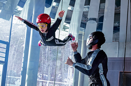 Die Turbine beginnt sich zu drehen und die Luft strömt immer schneller in den Windkanal. Nach einer kurzen Einweisung am Boden geht‘s nun los in die Indoor-Skydiving-Anlage. Wie ein Flughörnchen gleitet Dein Kind zusammen mit einem erfahrenen Fluglehrer durch die Lüfte. Der Wind ist dabei so schnell, dass für 4 Minuten ein Gefühl des freien Falls erzeugt wird. Was für ein Erlebnis – so muss sich ein Fallschirmsprung anfühlen!