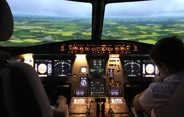 Wenn der Tower den virtuellen Flug freigegeben hat,rollst du mit der Maschine über die Landebahn, lässt die Motoren warm laufen und folgst den Anweisungen des Instruktors, um den Flugsimulator in die Luft zu bringen. Im Cockpit hast Du eine 210 Grad FULL HD Rundumsicht-Projektion und bist von einem Soundsystem mit Vibrationseffekten umgeben, die den Simulatorflug zu einem realistischen Flugerlebnis machen. Im Vorfeld habt Ihr Euch auf drei Zielflughäfen geeinigt, die Du während des zweistündigen Flugs mit dem Flugsimulator anfliegen wirst. Darüber hinaus wird simuliert, wie das Fluggerät unter extremen Wetterbedingungen reagiert und was passiert, wenn es zu technischen Störungen kommt. Dein Instruktor unterstützt Dich bei den teilweise schwierigen Landeanflügen.