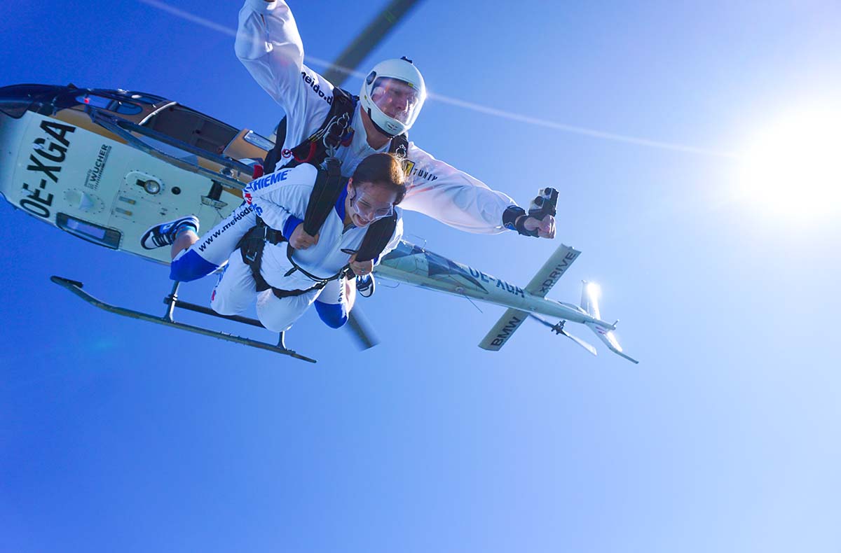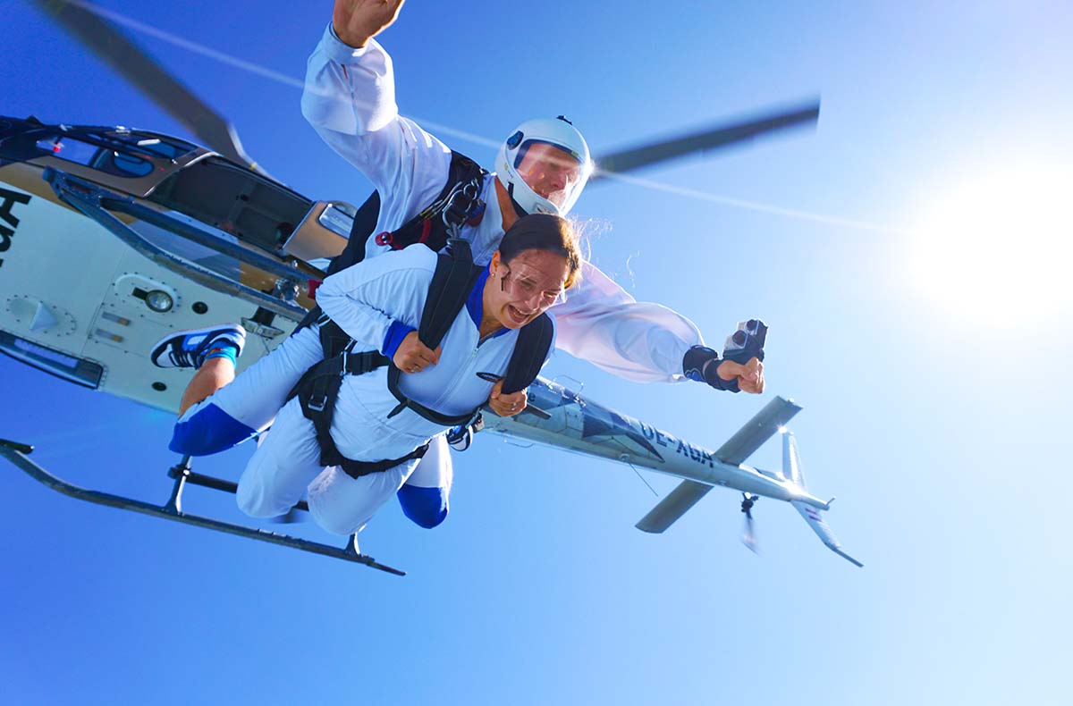 Wenn Dir echte Eindrücke wichtig sind, wirst Du diesen Tandemfallschirmsprung lieben. Gemeinsam mit einem Profi wirst du mit einem Helikopter auf die geplante Absprunghöhe von 3.000 bis 4.000 Metern gebracht – bereit für ein Gefühl, das Du so schnell nicht vergisst? Der freie Fall lässt Dein Herz rasen, während Wind und Weite Deine Sinne erfüllen. Euch verbindet ein Moment voller Lebendigkeit, der ganz besondere Erinnerungen schafft. Auch perfekt zu zweit, um intensive Gemeinsamzeit zu genießen und Zeit zusammen zu verbringen, die weit über den Augenblick hinaus wirkt. Ob mit einem Lieblingsmensch oder allein. Starte jetzt in dieses eindrucksvolle Fallschirmspringen und sammle Momente, die bleiben.