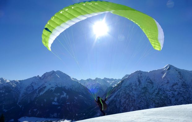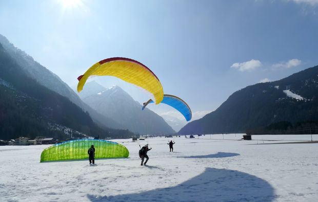 Bevor Du aber abheben kannst, musst Du zunächst einmal die Ausrüstung kennenlernen. Dies ist zum einen wichtig, damit Du weißt, was hier alles verarbeitet ist, wo es seinen Platz hat und auch wie es funktioniert. Darüber hinaus ist dieses Kennenlernen auch wichtig für das Vertrauen ins Material. Denn wenn Du vorab alles persönlich überprüfst, weißt Du auch, dass es sicher hält. Nach der Materialprüfung beginnst Du aber auch schon mit ersten Übungen. Hierbei wird Dir die richtige Lauftechnik beigebracht und Du wirst Aufziehübungen und Steuerübungen durchführen.