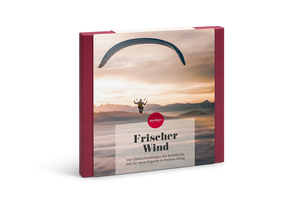 Deckel aufklappen und frischen Wind in den Alltag bringen. Das verspricht die Geschenkbox Frischer Wind. Ausgewählte Erlebnisse wie Gleitschirmfliegen, Bodyflying oder Bungee-Jumping bringen Herzklopfmomente der aufregenden Art. Das Beste daran? Die positive Energie wird für lange Zeit zum treuen Begleiter.