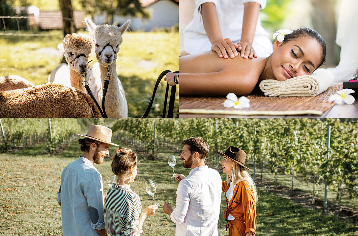 - Beispielerlebnisse: Aromaölmassage, Lama- & Alpaka-Wanderung, Weinverkostung
