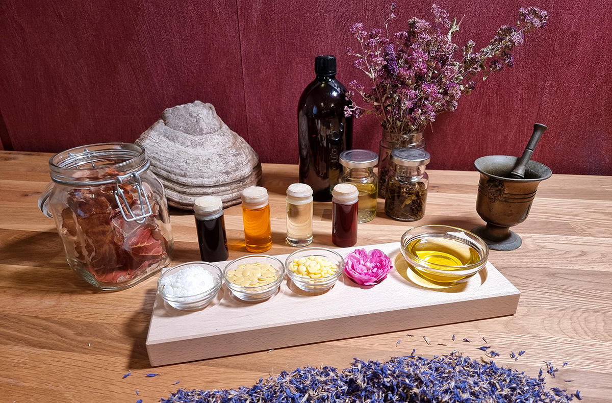 - Sammeln der Zutaten im Duft- und Heilpflanzengarten (je nach Witterung, ansonsten getrocknete Zutaten)