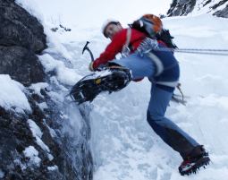 - Erste Kletterversuche mit Steigeisen und Pickel am Wasserfall