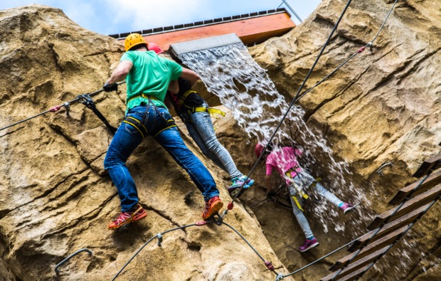 - Klettern in der Outdoor-Bergwelt (10 Kletterrouten am Felsen, 8 Erlebnishöhlen, 1000 natürliche Griff- und Trittstrukturen, 7m hoher Wasserfall, Gipfelkreuz mit Gipfelbuch)