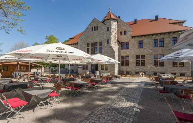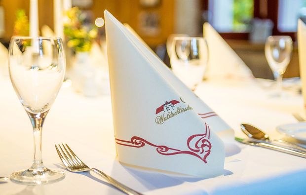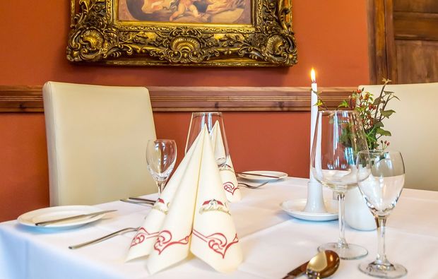 Für Euren besonderen Abend im stilvollen Restaurant hat der Chef de Cuisine ein exquisites 4-Gänge-Menü konzipiert. Lasst Euch von den köstlichen Gerichten verzaubern, während leise Musik den richtigen Hintergrund für Euren romantischen Abend bietet. Genießt Euer Candle-Light-Dinner in Nebra mit allen Sinnen. Zum Hauptgang wird Euch zudem ein korrespondierendes Glas Unstrutwein gereicht, das perfekt mit den Köstlichkeiten auf Euren Tellern harmoniert. Jetzt könnt Ihr noch einmal Eure Gläser erheben. Und wenn Ihr Euch nach Eurem romantischen Abend wünscht, die traute Zweisamkeit solle noch nicht so schnell zu Ende gehen, dann gönnt Euch doch etwas und bucht noch eine Nacht im Hotel des Waldschlösschens dazu.