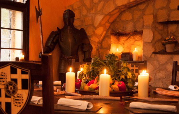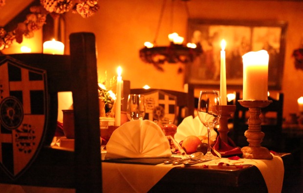 Das Restaurant bietet eine Tafelrunde am Kamin, eine Schankstube und eine offene Grillstelle. Euch erwarten klassisch mittelalterliche Speisen wie Spanferkel oder Wildschwein und die dazu passenden Weine. Ihr könnt natürlich auch ein vegetarisches Menü wählen. Das Candle-Light-Dinner für Zwei in Eisenach, in einer solch besonderen Location, ist vor allem für Fans des Mittelalters und Freunde von deftigem Essen geeignet, aber auch alle anderen Gäste finden hier das Passende. Als Paar erlebt Ihr hier ein Candle-Light-Dinner für Zwei im Lutherhotel Eisenacher Hof in Eisenach wie Ihr es nie vergessen werdet. Schafft Euch gemeinsame Momente und Erinnerungen, die lange währen und genießt ein paar Stunden Zweisamkeit nur für Euch.