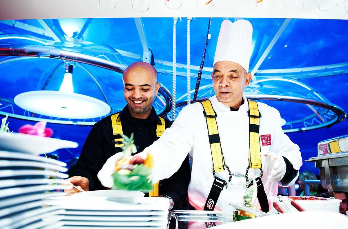 Ihr sitzt in ca. 50 Metern Höhe, die Lichter der Stadt glitzern unter Euch, und vor Euch wird ein exquisit zubereitetes 4-Gänge-Menü serviert. Schon der Welcome Drink und der Aperitif versetzen Euch in genau die richtige Stimmung, während Ihr Euch auf eine kulinarische Reise beim Dinner in the Sky begebt, die von einer raffinierten Vorspeise bis zu einem himmlischen Dessert reicht.