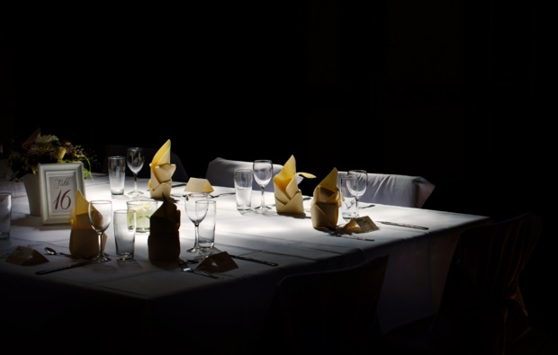 Da jegliche Lichtquelle verboten ist, bitten wir Sie, Ihre Handys ausgeschaltet zu lassen und Uhren oder andere technische Gegenstände mit fluoreszierenden Elementen am Empfang abzugeben. Ferner ist das Rauchen untersagt. Für eine Zigarettenpause oder sonstige Bedürfnisse wird Sie Ihr Kellner auf Wunsch jederzeit in den Empfangsraum bringen. Für das Dinner in the Dark sollten Sie sich mind. 2 Stunden Zeit nehmen.