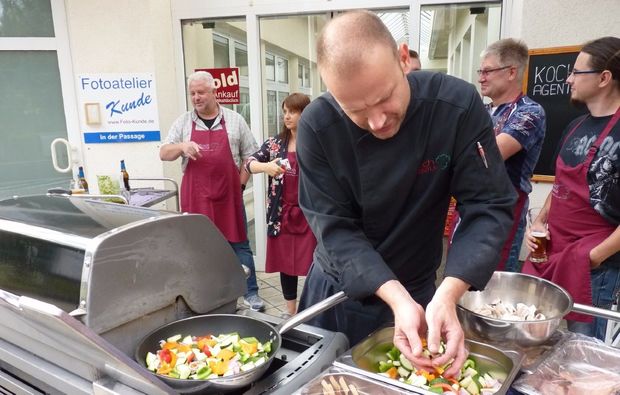 Doch bevor es soweit ist, stehen zu Beginn natürlich diverse Vorbereitungen auf dem Programm! Nach einer kleinen Lebensmittelkunde beginnst Du mit dem Anrichten der Marinaden und Dips und kümmerst Dich um unterschiedliche Beilagen. Danach landet dann eine ausgewählte Komposition aus Lachs oder Forelle, Bierhähnchen, Lamm, Jungschweinrücken und Grillgemüse auf dem Rost. Serviert mit Süßkartoffeln und Baguette entstehen beim Grillkurs in Dresden delikate Vor- und Hauptspeisen vom Grill. Jetzt fehlt eigentlich nur noch ein guter Nachtisch? Bei diesem Grillevent der Extraklasse wird der selbstverständlich auch auf dem Grill zubereitet. Hast Du schon einmal eine gegrillte Eisbombe probiert? Nach dem Grillkurs in Dresden weißt Du, wie sie schmeckt! Du bist neugierig wie diese Gerichte zubereitet werden? Bei diesem diesem Grillkurs in Dresden wird Dir jeder Arbeitsschritt von einem erfahrenen Experten gezeigt!