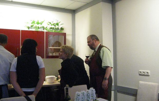 Italienisch Kochen in Erfurt beginnt ganz nach italienischer Manier mit einem spritzigen Begrüßungs-Prosecco. In ungezwungener und lockerer Atmosphäre lernst Du so Deine Mit-Köche sowie die wahren Profiköche kennen, die Dich später mit hilfreichen Tipps und Tricks rund um die italienische Küche versorgen werden. Unter deren fachmännischer Anleitung bereitest Du außerdem Dein erstes professionelles italienisches 3-Gänge-Menü zu, welches die regelmäßigen Restaurantbesuche komplett überflüssig macht. Erfrischendes Mineralwasser steht Dir während des 5-stündigen Kurses kostenlos zur Verfügung, genauso wie alle nötigen Zutaten und Kochutensilien. Deinem ganz persönlichen, perfekten Dinner steht so nichts mehr im Wege. Im Anschluss an das spaßige und lehrreiche italienisch Kochen genießt Du in gemütlicher Runde die köstlichen Früchte Deiner anstrengenden Arbeit und lässt Dich zudem mit Rot- und Weißwein verwöhnen.