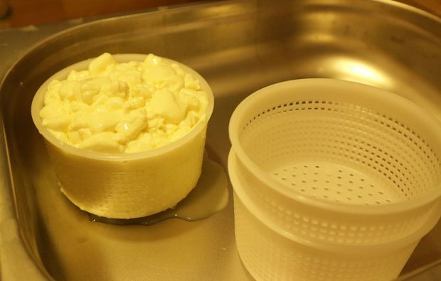 Herstellung eines Frischkäselaibes, der anschließend mit nach Hause genommen wird
