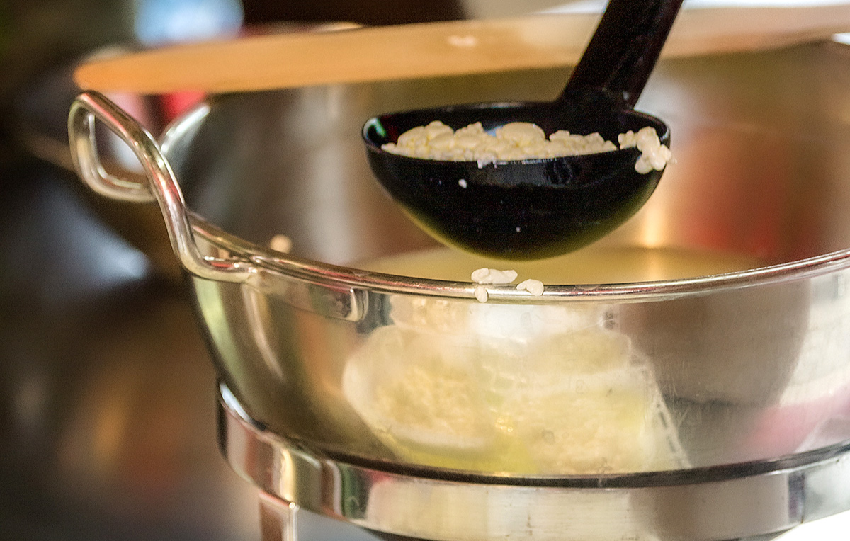 Genug geschnackt, denn jetzt wird es ernst. Nun wird die Frage nach der richtigen Temperatur, Kesselgröße und der besten Milch fachkundig geklärt. Mit Unterstützung eines Profis wird Dir Schritt für Schritt beigebracht, wie eine richtige Käseherstellung gelingt. Und damit Du Deinen großartigen Tag auch zuhause noch nicht aus dem Kopf und der Nase bekommst, darfst Du Deine eigene Kreation zum Verköstigen mitnehmen.