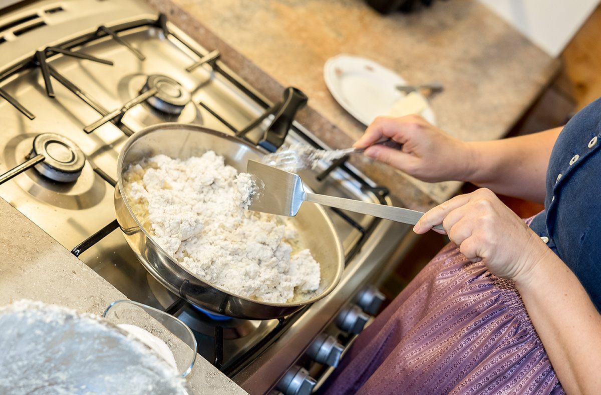 Gemeinsames Zubereiten des traditionellen Miasl (süß & sauer) in der Hüttenküche