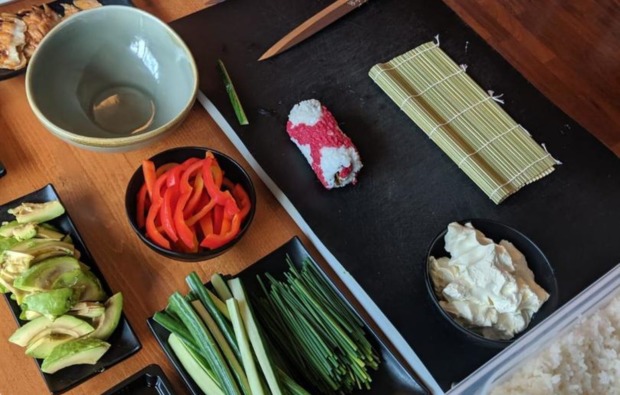 gemeinsame Verkostung der gefertigten Sushi am Ende des Kurses
