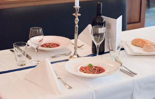Um dieses Gefühl noch intensiver abzurunden, erwartet Dich beim Dinner in München ein historisches 3-Gänge-Menü. Schmause wie der König höchstpersönlich, wenn Du Dich an einer köstlichen Vorsuppe labst, dann einen deftigen Hauptgang zu Dir nimmst, um zum krönenden Abschluss in den Genuss eines süßen Desserts zu kommen. Die Kombination aus dieser unvergleichlichen Kulisse sowie dem schmackhaften Menü und den Geschichten um König Ludwig bilden einen außergewöhnlichen Abend, der Dich tief in diese Zeit eintauchen lässt und gefangen nimmt. Wenn Du anschließend durch das Schloss wandelst, kannst Du den Spuren des Königs folgen und die Dir erzählten Geschichten des Dinners in München Revue passieren lassen.